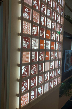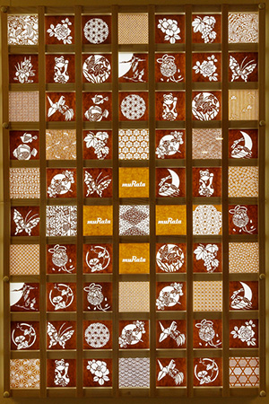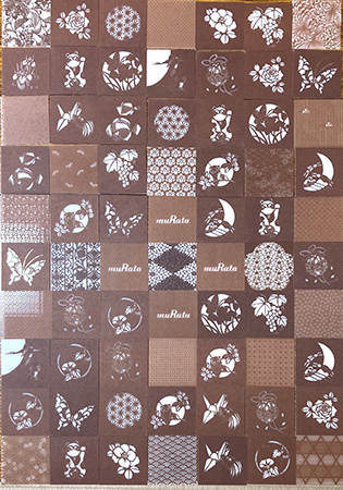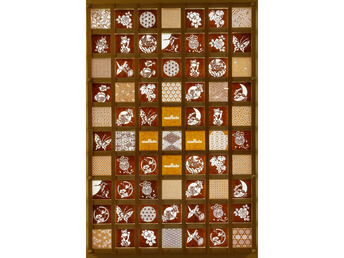 - 伊勢形紙職人による、村田製作所様社名ロゴ4枚、小紋型20枚を加えて全70枚のパネルを作成